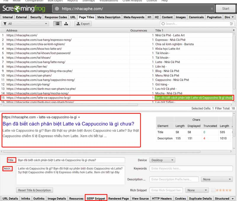 Screaming Frog lets you preview how a page appears in Google SERPs. Select any URL, then click SERP Snippet on the bottom panel.
