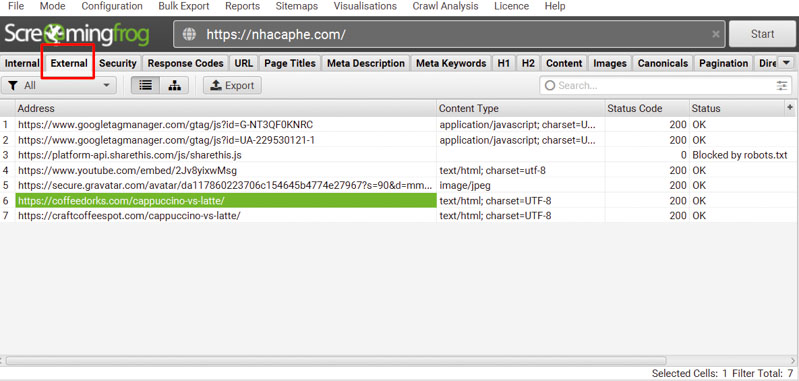 Go to the External tab and review by Address, Content Type, and Status Code.