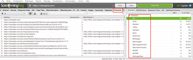 Open the Directives tab to review technical directives like index/noindex, follow/nofollow, and other attributes. You can also verify how robots.txt is implemented and whether further optimization is needed.