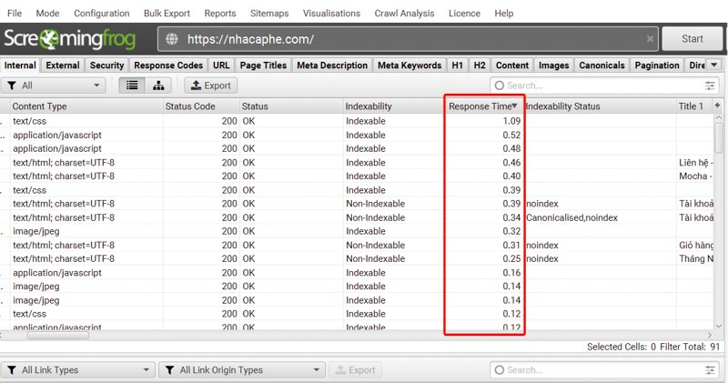 To check response time: go to Internal and look at the Response Time column. If a page takes longer than 2 seconds, consider optimizing (caching, compression, CDN, better hosting, etc.).