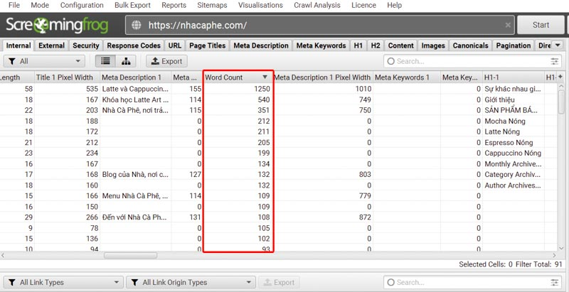 Google favors pages with useful, expert content over thin pages. In Internal, sort by Word Count to find thin pages.